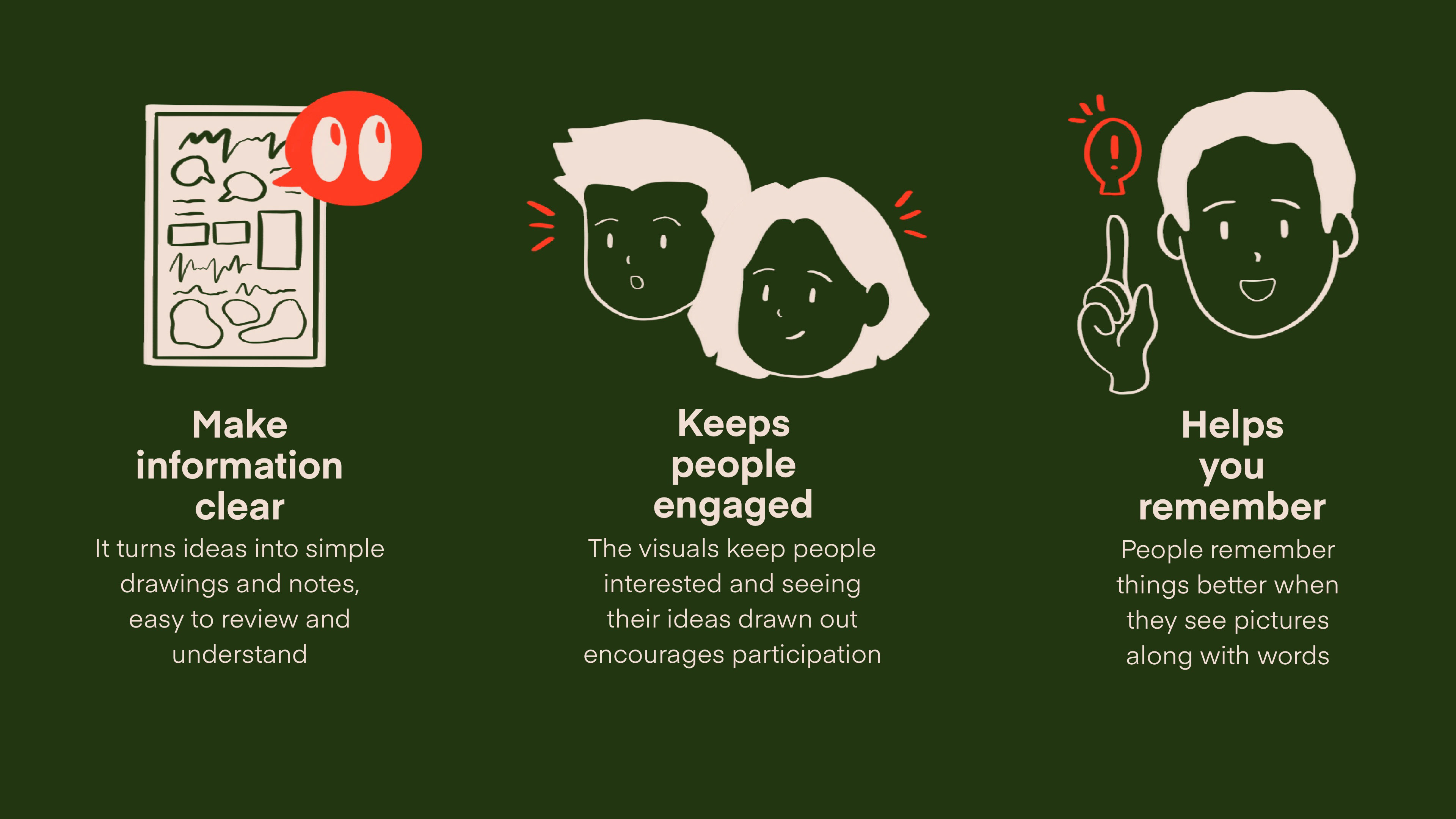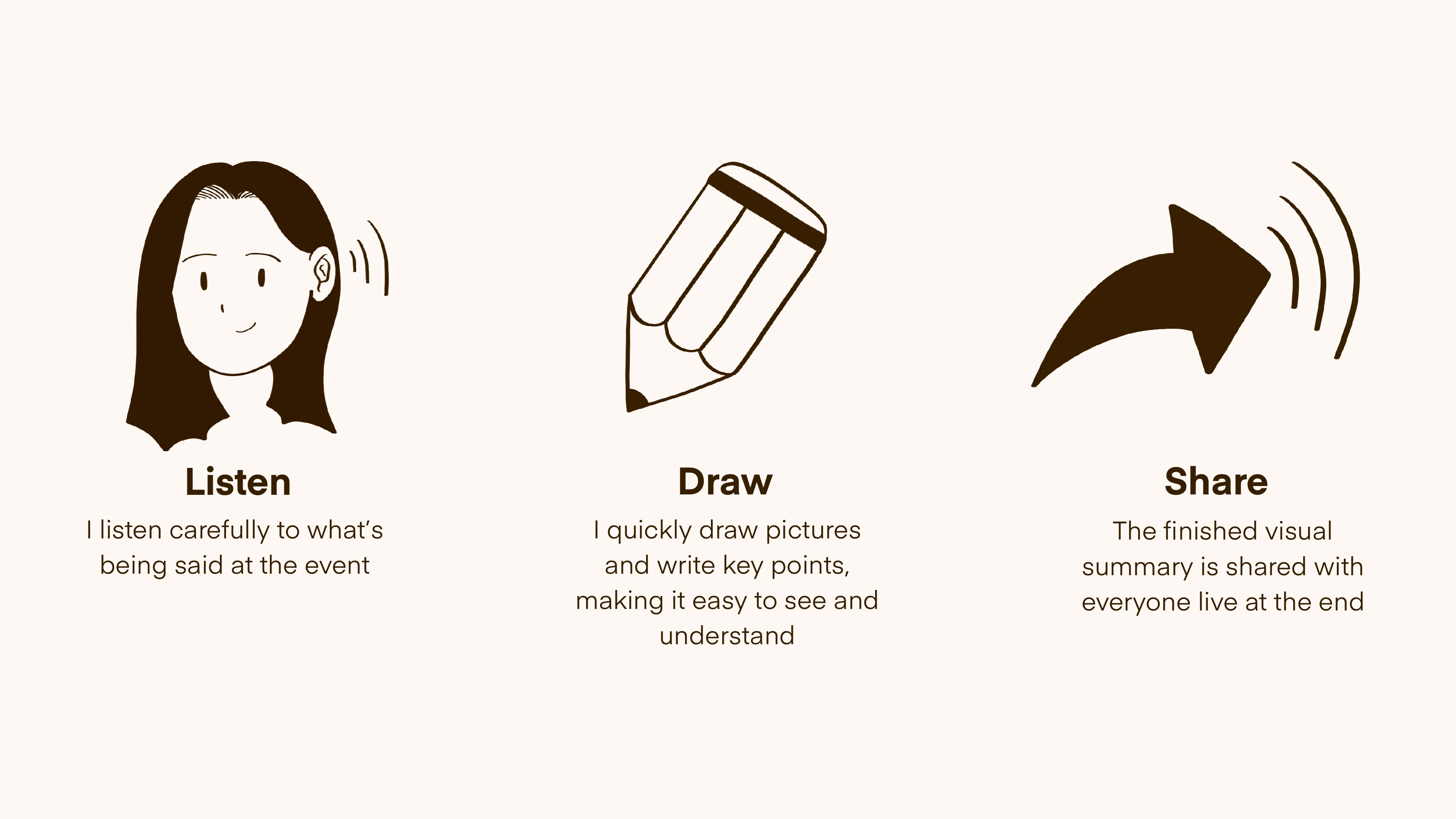 Graphic recording is a way of drawing out important ideas and information from a talk, workshop, or event in real-time. As a graphic recorder, I listen to what's being said and then create beautiful visual notes, making it easy for the audience to understand and remember the key points. It's like making a live, visual summary of the conversation.